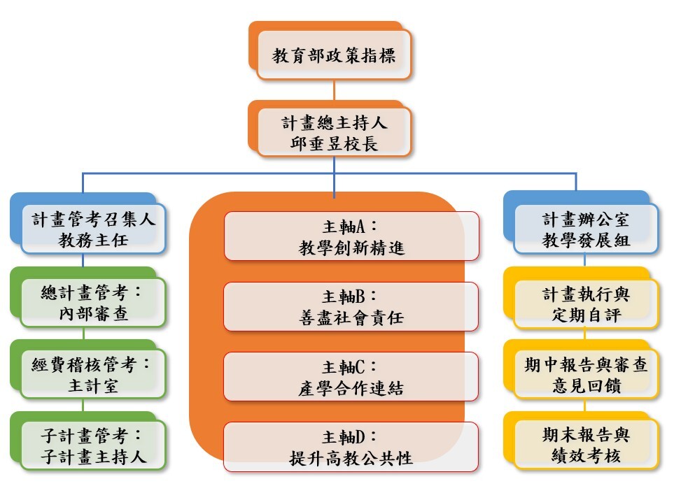 本計畫推動組織以校長為計畫主持人,教務主任 為計畫管考召集人,負責管理各項業務之進度管考,教務處 教學發展組 為 計畫管考辦公室,負責計畫執行與管理各項績效考核業務。